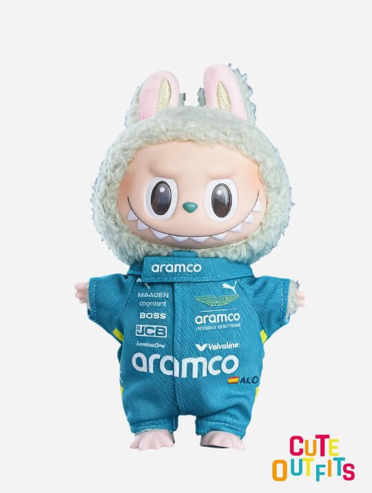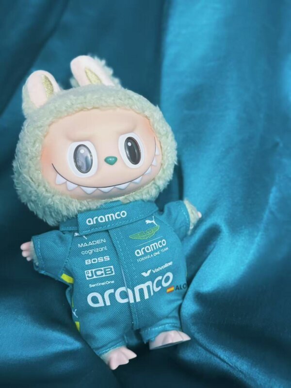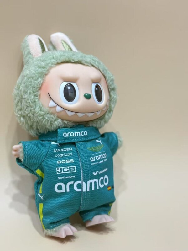 This doll outfit is based on the Aston Martin F1 Team racing suit, including a jumpsuit + board shoes + exclusive hanger, perfectly fitting multiple series of 17cm Labubu.